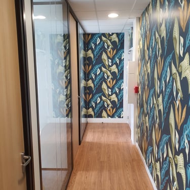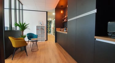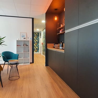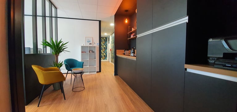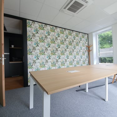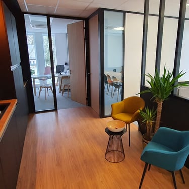 Entreprise de 4 personnes qui reçoit régulièrement des groupes à former, il fallait prévoir une salle de réunion pour 8 personnes, une cuisine adaptée, un petit open space et 3 bureaux fermés.